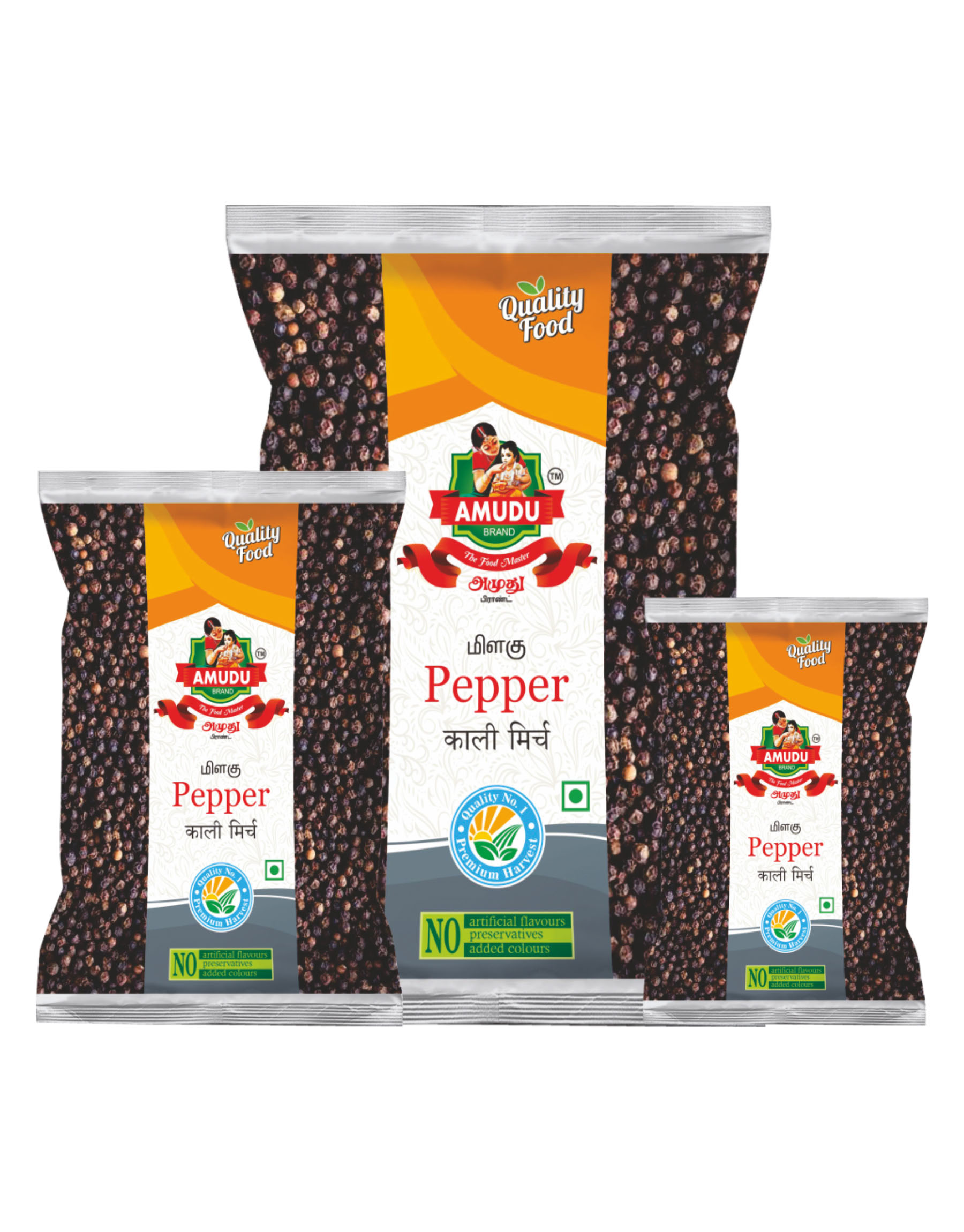 Black Pepper, often called the “King of Spices,” is one of the most prized and widely used spices in the world. Our premium-quality peppercorns are carefully harvested and sun-dried to preserve their sharp aroma, bold flavor, and natural essential oils. Known for their strong pungency and warm spice, black pepper enhances the taste of a wide variety of dishes—soups, curries, marinades, salads, and spice blends. Rich in antioxidants and piperine, it supports digestion and boosts metabolism. Hygienically packed to maintain freshness, purity, and potency in every grain.